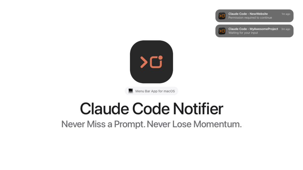 A lightweight menu bar app that watches your Claude Code sessions and instantly notifies you the moment Claude needs your attention. Whether it's a permission request, a clarifying question, or a prompt waiting for your response - you'll know immediately.